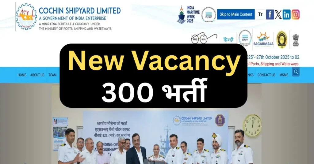 जॉब डेस्क, नई दिल्ली। कोचीन शिपयार्ड लिमिटेड ने युवाओं के लिए अप्रेंटिसशिप का अवसर खोला है। इस भर्ती अभियान के तहत कुल 300 पदों पर उम्मीदवारों का चयन किया जाएगा। आवेदन प्रक्रिया आज यानी 29 अक्टूबर 2025 से शुरू हो चुकी है और इच्छुक उम्मीदवार 15 नवंबर 2025 तक ऑनलाइन माध्यम से आवेदन कर सकते हैं।