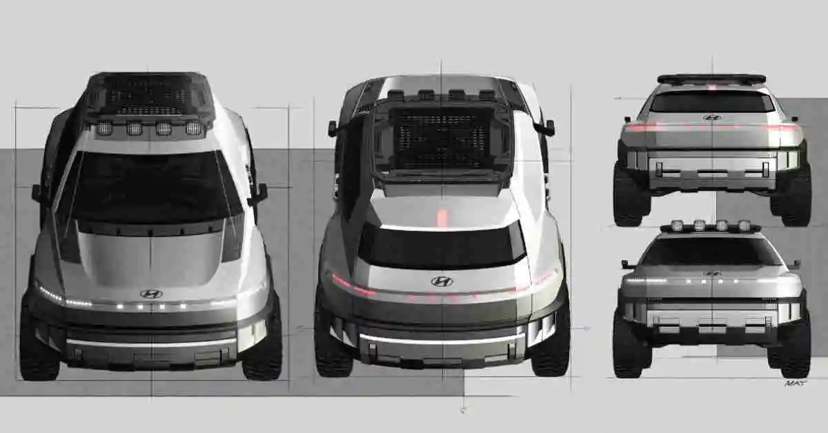 Crater Concept का फ्रंट प्रोफाइल Hyundai Nexo से थोड़ा मिलता-जुलता है, लेकिन साइड और रियर सेक्शन पूरी तरह नया और बोल्ड है। इसमें Hyundai का नया क्वाड डॉट लोगो, पिक्सल-थीम हेडलाइट्स और टेललाइट्स, मस्कुलर बोनट, बड़ा स्किड प्लेट, रूफ रैक और फ्लड लाइट्स जैसे एलिमेंट्स शामिल हैं। इसके अलावा चौड़े M/T टायर्स, फ्लेयर्ड व्हील आर्च और बाहर की ओर निकले व्हील सेटअप इसे एक मजबूत ऑफ-रोड प्रेजेंस देते हैं।