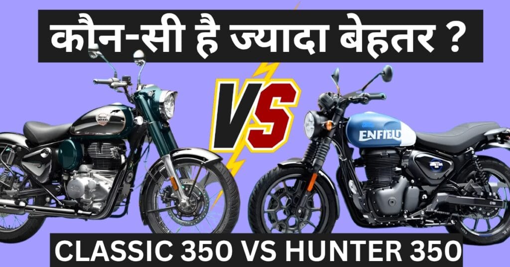Classic 350 और Hunter 350 दोनों ही Royal Enfield की पॉपुलर बाइक्स हैं। दोनों में एक जैसा इंजन है, लेकिन डिजाइन, वजन और सेटअप उन्हें अलग बनाते हैं। Classic 350 क्लासिक लुक और हाईवे राइडिंग के लिए बेहतर है, जबकि Hunter 350 स्पोर्टी डिजाइन और शहर में आसान हैंडलिंग के लिए बनाई गई है। चुनाव पूरी तरह आपकी जरूरत और पसंद पर निर्भर करता है।