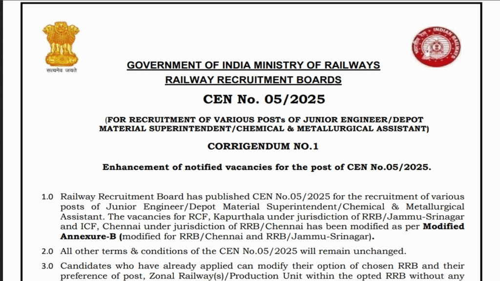 रेलवे में जूनियर इंजीनियर बनने की तैयारी कर रहे युवाओं के लिए एक जरूरी अपडेट सामने आया है। रेलवे भर्ती बोर्ड (RRB) ने JE पदों की संख्या बढ़ाने के साथ-साथ आवेदन की अंतिम तिथि भी आगे बढ़ा दी है। अब उम्मीदवार 12 दिसंबर 2025 तक आवेदन कर सकते हैं।